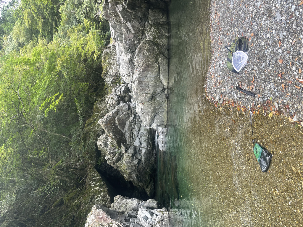 前回はこの沢の所までだったので更に上流へ、これ以上は上流に歩いていけない壁にぶつかり戻る。泳げば行けそうだが泳げないのでここで断念、この上に行ける人は良い思いをしてるに違いない。川は右斜めから流れている。岩盤の周りは2メートル位の水深がある、減水の流れでこれだから平水だとここまで上がって来られるかどうか?