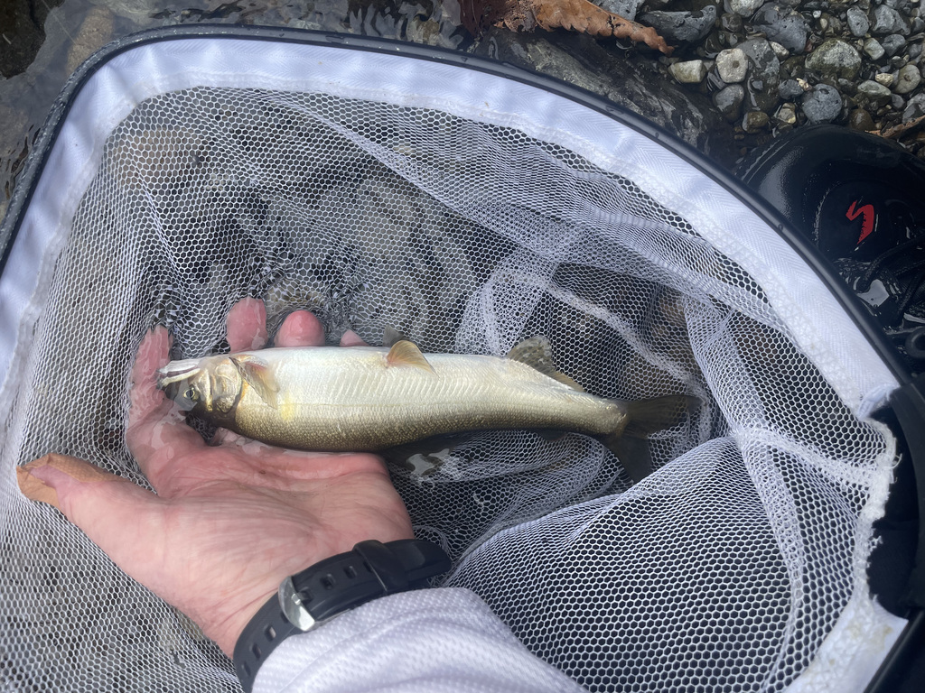 なかなか釣れないので野宿するベースに戻って2時頃から4時までやることにした、下流に歩いて野営ベース迄釣り上がる作戦だったのだが減水の影響なのか季節的な物なのか雑魚以外は全然釣れない、餌はブドウ虫でやや深みの岩盤突き当たりに餌を流すと強烈な当たりで硬中硬の竿をひん曲げて中々上がってこない、大きなアマゴだと思いあしらってタモに入れるとな、ななんと、なんと24センチの鮎、ブドウ虫に食い付くなんてビックリと同時に嬉しさも、、餌釣りの針にアユが背掛で釣れたことはあるけれど、まさかまさかのブドウ虫。今年は鮎の放流はしていないので他の組合が本流に放流した鮎が支流の小原川に入ってきたのだと思う。白子満タンで美味かった、今年の初物を口にできた。