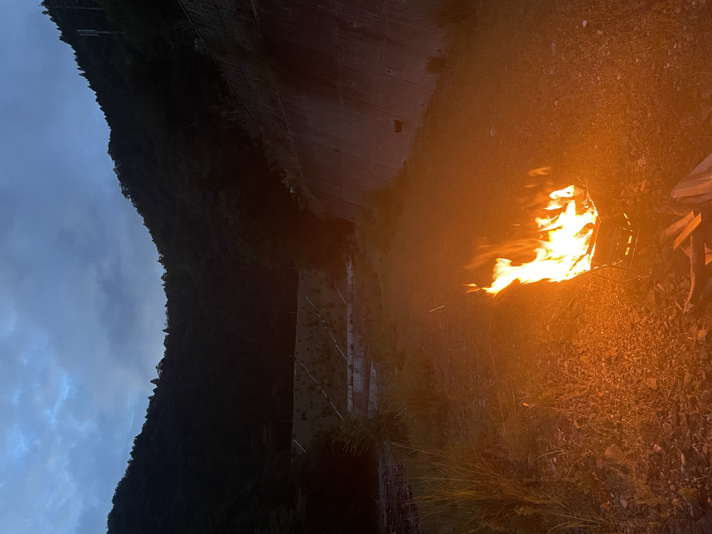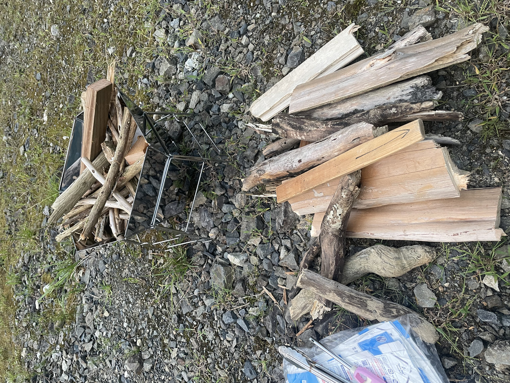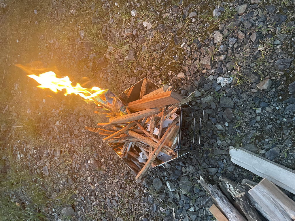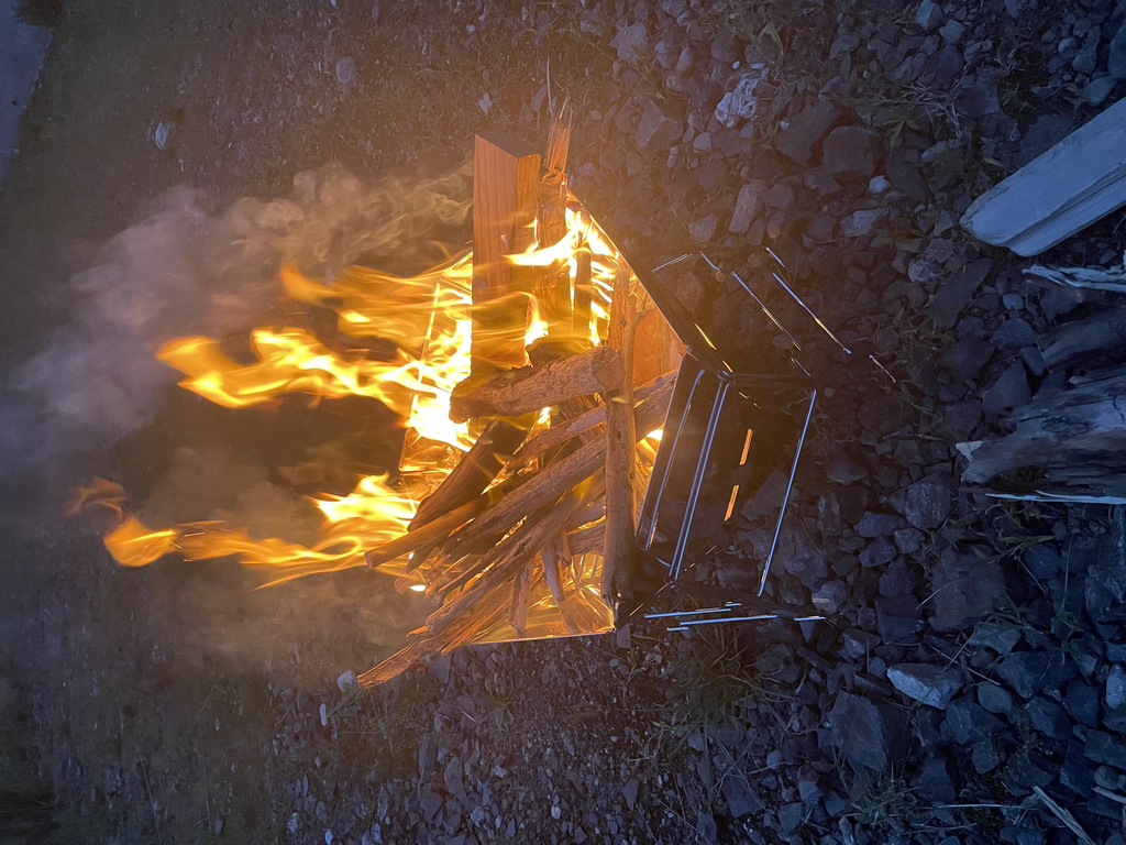 独りぼっちの夜は長いと言うことで焚き火台で焚火と成りました。河原で拾った流木と家から持ってきた少しの端材。